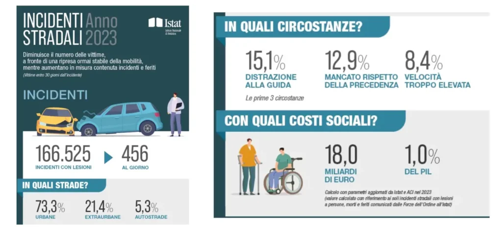 Nel 2023, secondo i dati ufficiali ISTAT, rispetto all’anno precedente, gli incidenti sono aumentati dello 0,4% 📈 e i feriti dello 0,5%, mentre le vittime sono diminuite del 3,8% 📉 rilevando, come incidentalità nel tempo rispetto al 2019 (prepandemia), una diminuzione del -3,3%, con un numero dei feriti del -6,9% e dei morti del -4,2%.