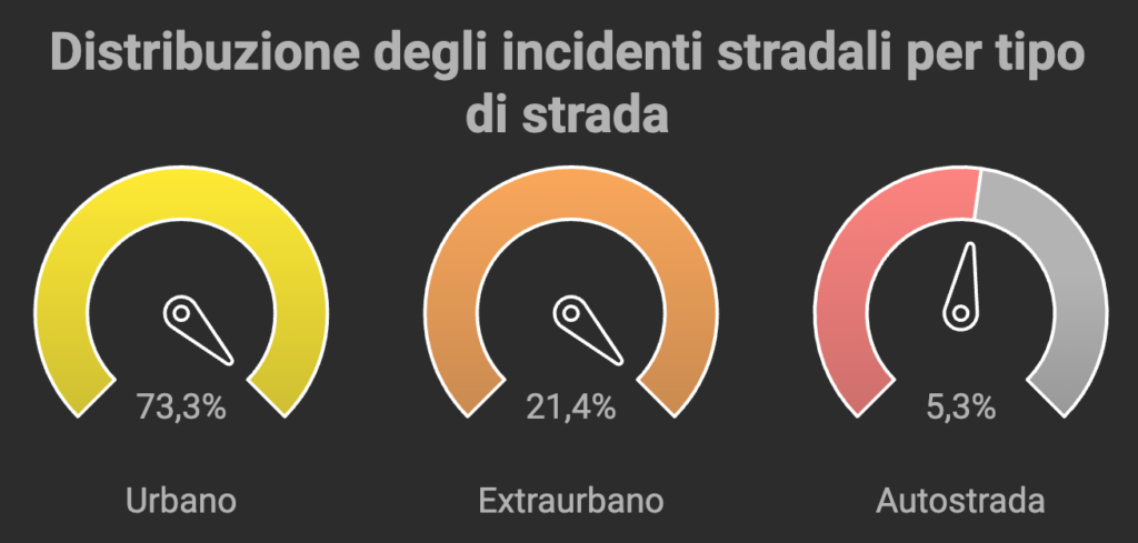 Il 73,3% degli incidenti avviene in strade urbane, mentre il 21,4% in strade extraurbane e il 5,3% in